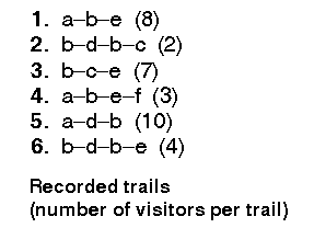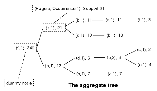 support: A tree node corresponds to a page in a trail and is annotated with the number of visitors having reached this page across the same trail prefix. This value is the ``support'' of a node, computed in the context of the node's predecessors up to the aggregate tree's root.occurence: In trails 2 and 6, page b has been accessed twice. We must distinguish between the difference occurrences of the same page, so that page revisits can be discovered.